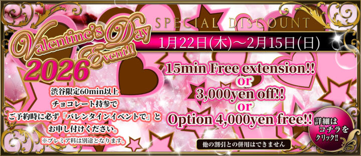 お電話時に雨が降っていたら当日限定「Rainy day discount~雨割~」発動!もちろんご利用時は降っていなくて大丈夫!75minコース以上3,000yen Off!さらにメルマガ会員様は渋谷でのご利用で+10min延長無料!デリの場合ですと、なんと最大6,000yen Off!必ず「雨割」の一言を添えていただきご予約お待ちしております!