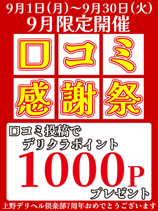 9月限定で各種風俗サイトより口コミ投稿頂いたお客様に