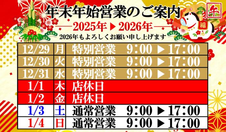 尚、誠に勝手ながら年末年始は下記の日程で休業とさせていただきます。