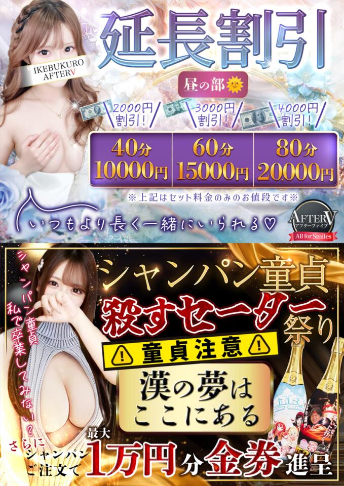 今週は昼の部延長料金割引!!夜の部はシャンパン童貞殺すセーター祭り!!(21時11分更新)|AFTER V(アフターファイブ)(池袋/セクキャバ)