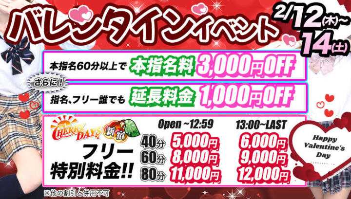 2月バレンタイン♪♪(14時38分更新)|チェリーデイズ新宿店(新宿歌舞伎町/セクキャバ)ご利用の際は必ず『情報局みた』とお伝えくださいチェリーデイズ新宿店03-3207-6377営業時間 AM9:00~ラストスマホで見るこの割引について報告 『情報局みた』で業界最安40分5,000円2026/02/13 23:00 まで毎月開催?!コスチュームイベント!もっと見る10人のユーザーが良かったと口コミえな(?)T163 85(C)-58-867人のユーザーが良かったと口コミもみじ(?)T164 86(E)-59-846人のユーザーが良かったと口コミまふゆ(?)T167 85(E)-58-84もっと見る01/13 入店!(体入)もあ(?)T157 88(F)-57-8712/15 入店!えり(?)T165 91(G)-58-8312/02 入店!ひびき(?)T147 82(C)-57-82お店のホームページ
