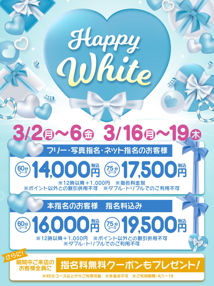 ハッピーホワイト(02/16更新)|WHITE(ホワイト)(水戸市天王町/ファッションヘルス)ご利用の際は必ず『情報局みた』とお伝えくださいWHITE(ホワイト)029-306-8496営業時間 10:00~24:00スマホで見るこの割引について報告 『情報局みた』で業界最安45分10,400円2026/02/28 23:55 までもっと見る02/17 入店!激推し!可愛さアイドル級!さや(20)T145 82(C)-56-8302/10 入店!声も顔もメチャかわいい!みく(37)T153 84(D)-58-8701/11 入店!どハマり必至のイチャイチャナース!こと(20)T158 83(C)-57-85お店のホームページ