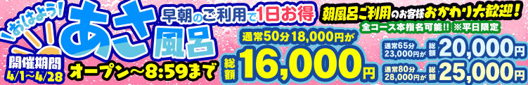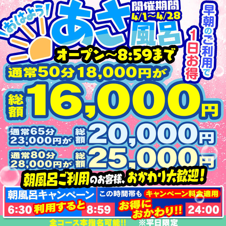 【あさ風呂キャンペーン】 朝イチが一番オトク!(03/30更新)|ハピネス東京(五反田/ソープランド)