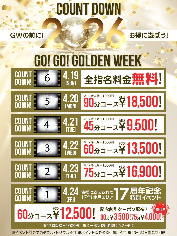 カウントダウン!!ゴーゴーゴールデンウィーク!!(19時48分更新)|ぼいんWORK(水戸市天王町/ファッションヘルス)
