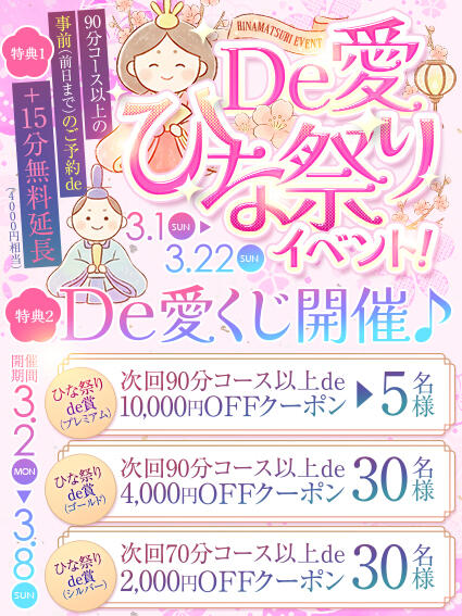 ひな祭りde賞(プレミアム) 次回90分コース以上de10,000円offクーポン×5名様