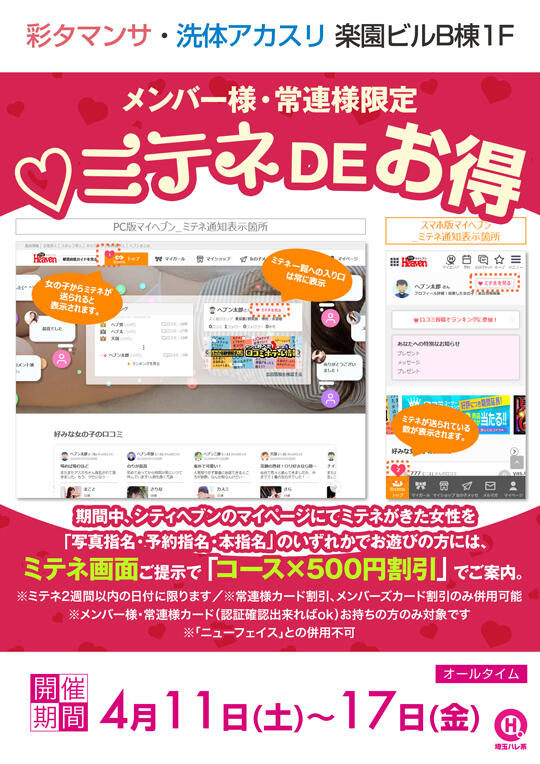期間中、シティヘブンのマイページにてキテネがきた女性を「写真指名・予約指名・本指名」のいずれかでお遊びのご主人様には、キテネ画面ご提示で「コース×500円割引」でご案内。