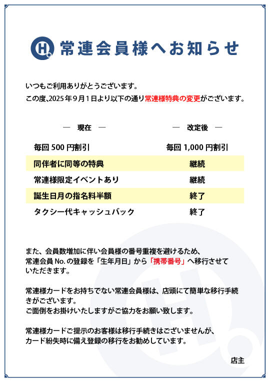 【現在】 常連様限定イベントあり → 【改定後】 継続です。