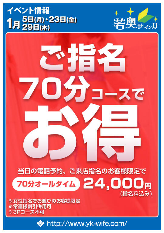当日の電話予約、ご来店指名のお客様限定で70分オールタイム24,000円(指名料込み)