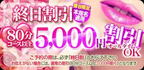 ご予約の際は必ず「終日割引」とお伝えください。 お伝えがない場合には通常の割引(80分コース以上 3,000円割引き)となります。