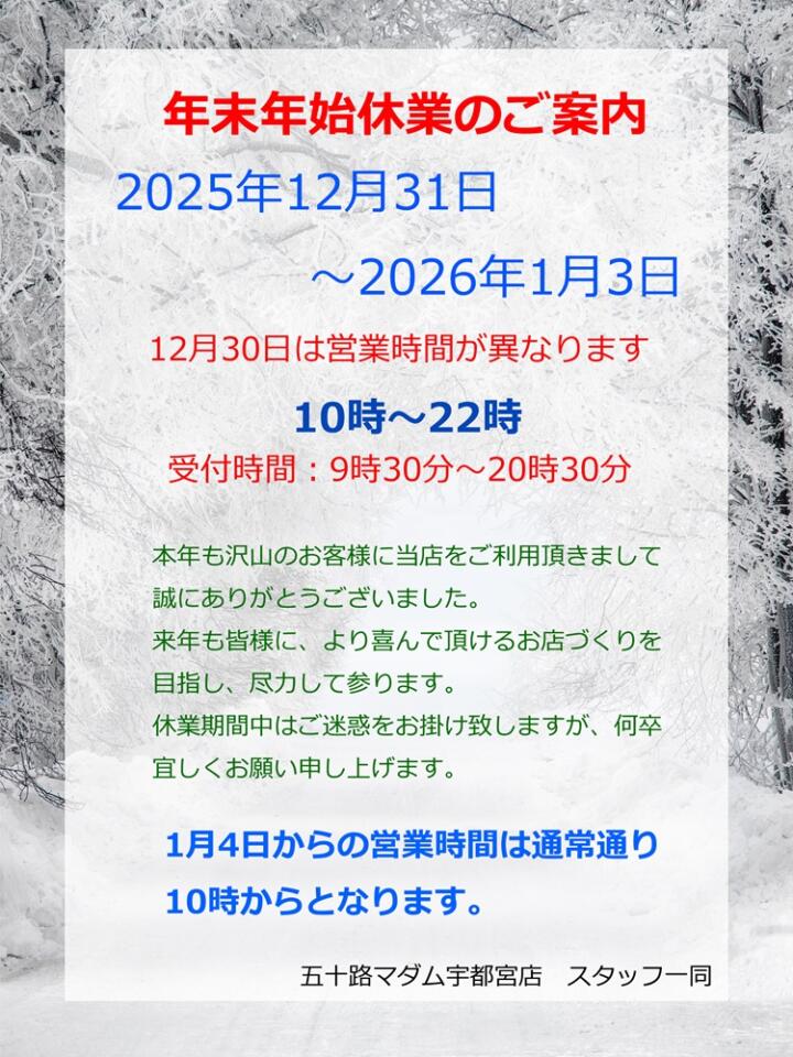 12月30日の営業時間変更と年末年始の休業期間のお知らせ(12/27更新)