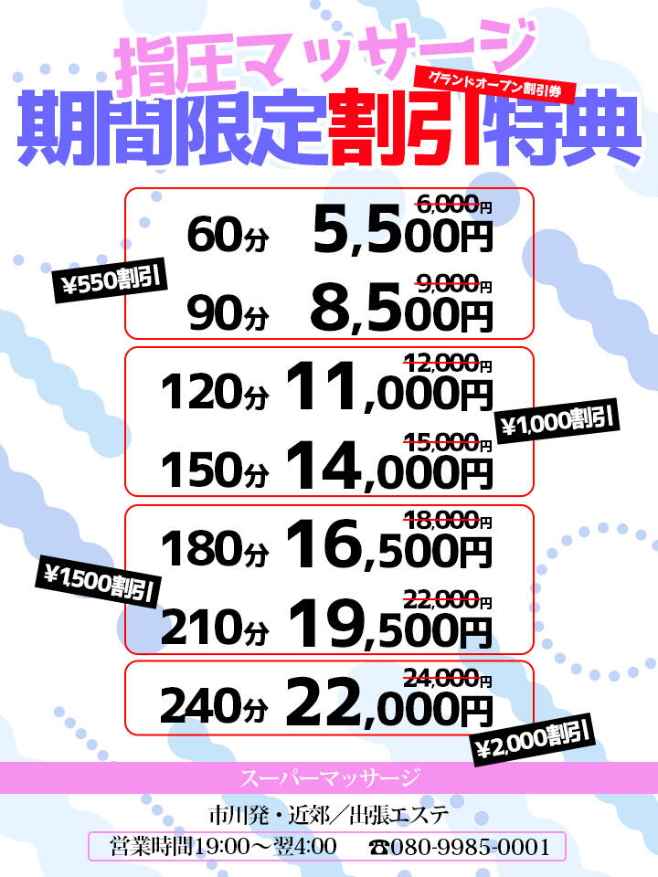 [60分~90分 550割引。120分~150分 ¥1000割引。 180分~210分 ¥1500割引。240分~ ¥2000割引。]