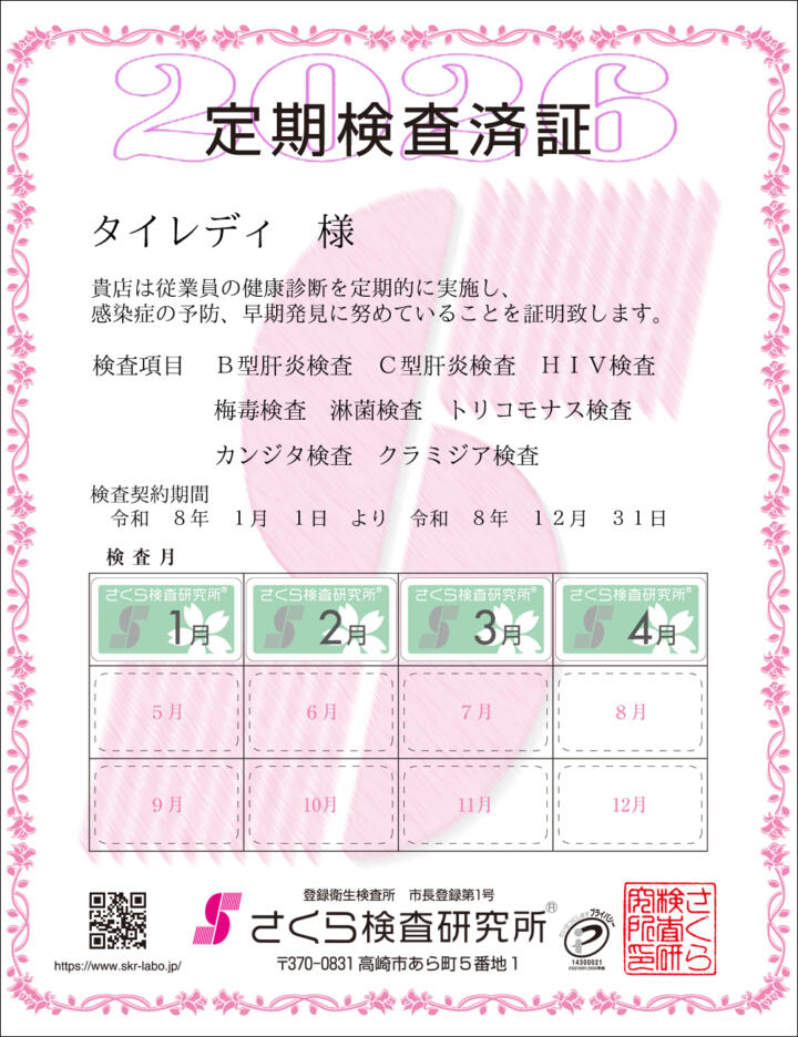 性病検査を毎月実施。 「外国人風俗店は心配」というお客様も安心してご利用頂けます(04/01更新)