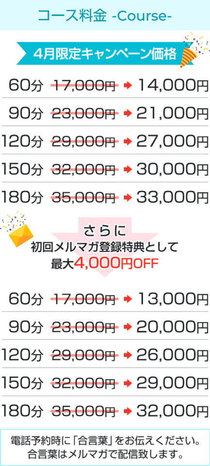 ③メルマガ割を併用する場合は、登録後メール内の「合言葉」をお伝えください。