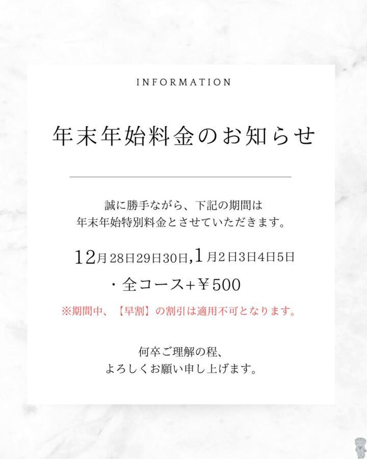 年末年始の期間中、誠に勝手ながら以下の日程において「年末年始特別料金」でのご案内とさせていただきます。
