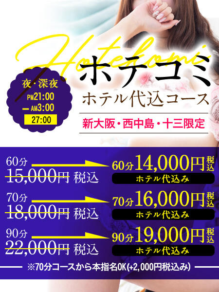 ※新大阪/西中島/十三にてご利用の際は+2,000円でホテル代込み!(150分以上から+3,000円)
