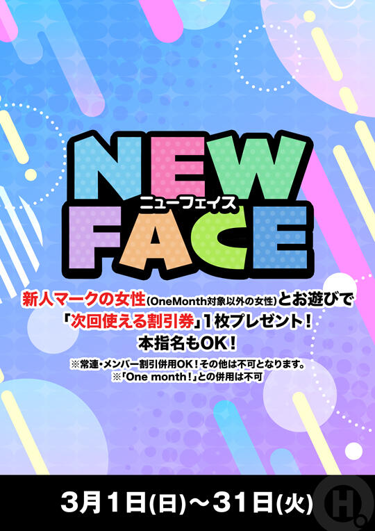 新人マークの女性(OneMonth対象以外の女性)とお遊びで「次回使える割引券」1枚プレゼント!本指名もOK!
