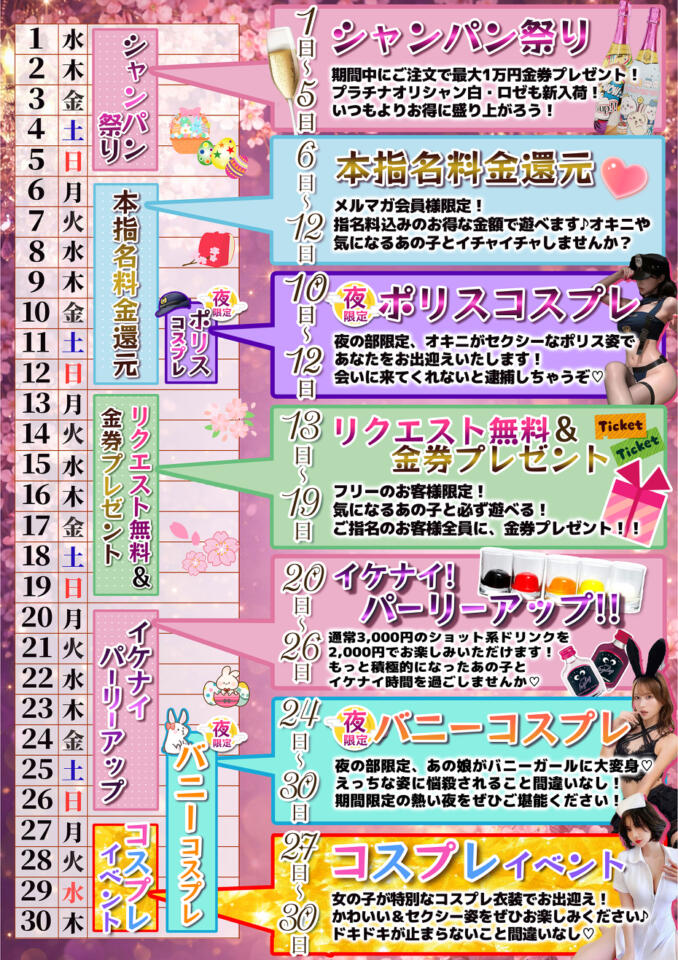 シャンパン祭りで華やかにスタートし、本指名料金還元、夜限定ポリスコスプレ、