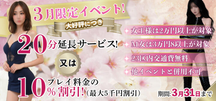 ■3月限定イベント!■ 20分延長サービス! 又は プレイ料金の10%割引! (最大5千円割引) *23区内交通費無料(03/01更新)