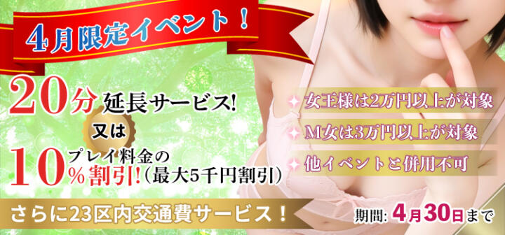 ■4月限定イベント!■ 20分延長サービス! 又は プレイ料金の10%割引! (最大5千円割引) *23区内交通費無料(04/01更新)