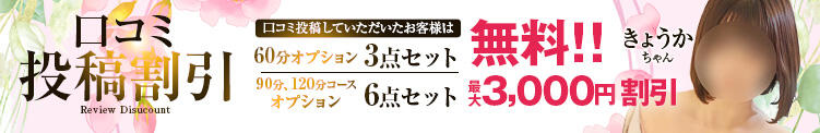 予約電話の際、口コミ時のペンネーム、投稿して頂いた媒体名をお伝え下さい。